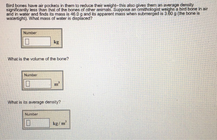 Bird Bone Density / Suppose an ornithologist weighs a bird bone in air and in water and finds its mass is 45.0 g and its apparent mass when submerged is 3.60 g (the bone is watertight).